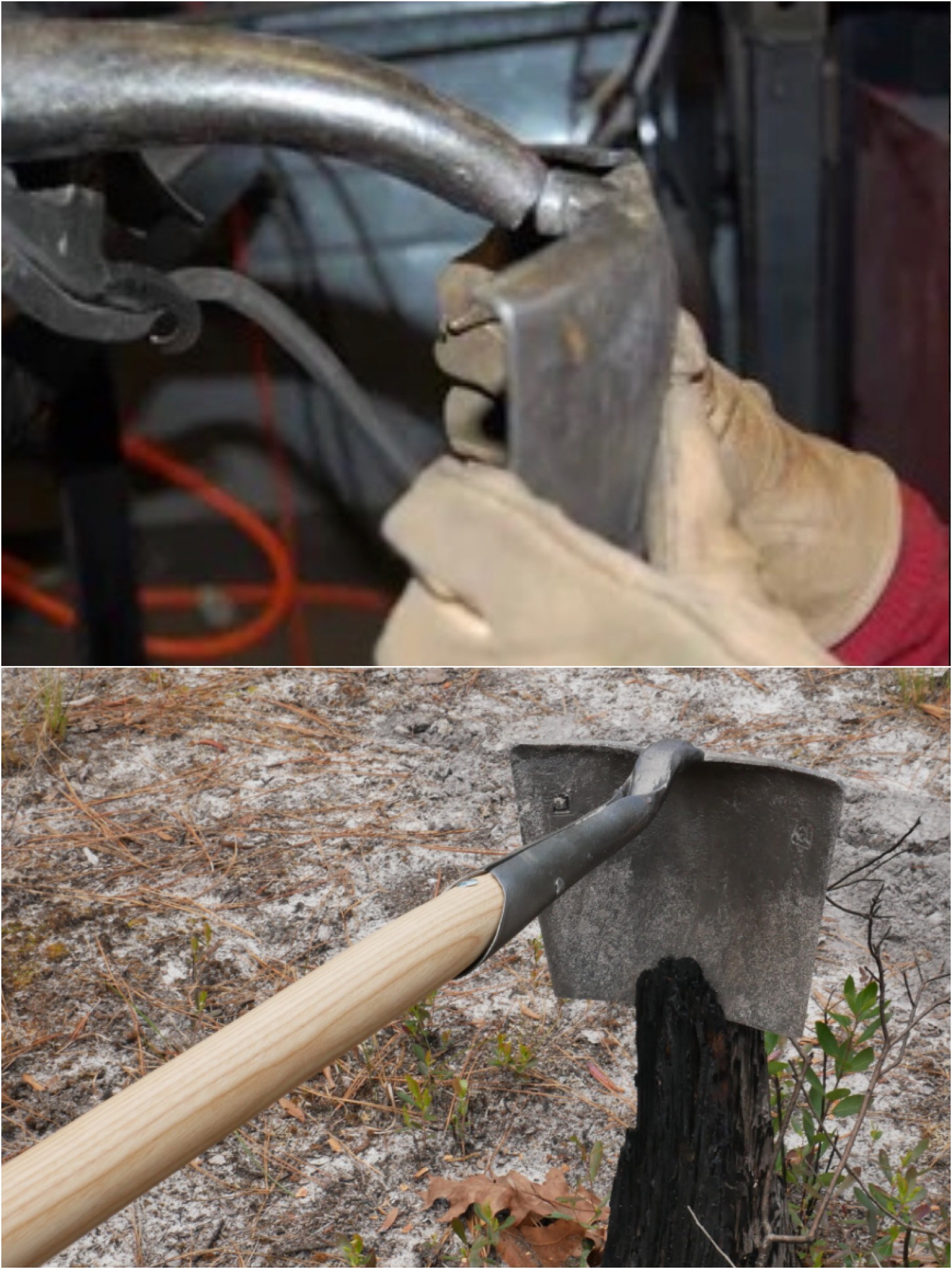 What they came up with was ingenious: take an old beat-up fire shovel, cut the blade, flip it 180 degrees, and weld it back on at a 90 degree angle (Top Picture). The result was a curved hoe-like tool that could dig, cut, and clear line faster than a standard shovel. This was the birth of what firefighters began calling the Rhino.